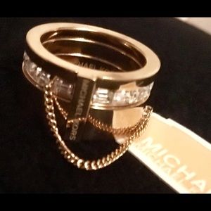 Up your jewelry game with this unique Micheal Kors ring🔹This eye-catching accessory features two connected gold-tone bands and baguette crystal band connected by a draped curb chain🔹Wear on one finger in barrel form or across two fingers for a stylish twist🔹