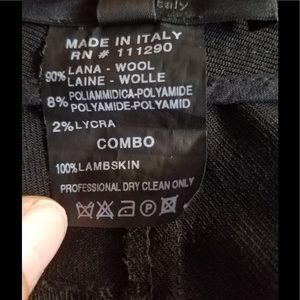 Stunning attention grabbing skinny black pants no sign of wear excellent condition wool & Italian soft lambskin combo pict speak for themself 8 inch zippers on inseam on bottom 2 sided zip pocket on front 37 inch from waist down 28 inseam original price around 1200 + us tax received after modeling work for the brand last pict is of me posing in them for visual can be dressed up with stiletto heels or dress down with flats