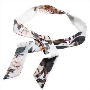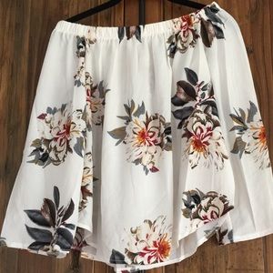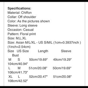 Beautiful blouse with a neutral and elegant floral pattern. Elastic neck line to be worn off the shoulder. Loose and flowing fit. Optional sash included, but is not attached to the top. Top can be worn with or without it. Soft feminine chiffon material. Absolutely stunning in person! Runs on the smaller size so please measure carefully. Bundle to save. Last photo is mine taken in natural lighting, no adjustments made .