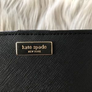 Brand New KATE SPADE Stacy Laurel Way Wallet in Black. Saffiano Leather. Snap closure. Interior features12 slot pockets for credit cards and 4 slot pockets for currency. Window for ID. Zippered Pocket on exterior backside. Measures Approximately 3.5" X 6.75". Retails for $119 + tax.