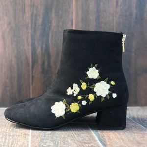 Floral Embroidered Low Chunky Block Heel Bootie