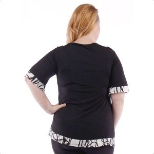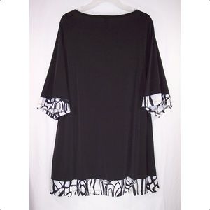 Black & White in color, v-neckline with inset, short sleeves, empire waist in front with tie accent, straight in back, straight hem, soft silky fabric is 90% polyester, 10% spandex, hand washable. NWOT Comes from a smoke free home.