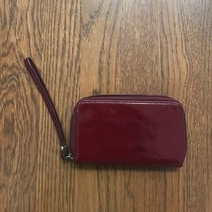 This versitile leather ouch can be used multiple ways. It is patent marroon. Excellent condition with no scuffs or signs of wear- minor discoloration on zipper