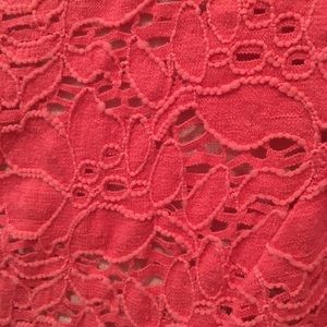 ✨Discounted Shipping✨ Beautiful coral lace dress! Perfect for daytime or date night! Cap sleeve, scoop neck. Pale pink liner. Cotton, nylon and spandex. Length from shoulder: 36.5" Only worn a few times. Some pilling, which is reflected in the low price.