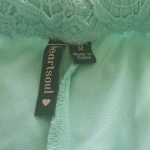 Like new, pretty and feminine HeartSoul lace shorts. Color is sea foam, aqua, mint green, No holes or stains. See pics for approx. measurements. Size on tag is Medium. Elastic waistband with ribbon bow in front.