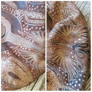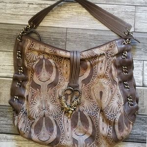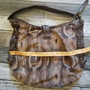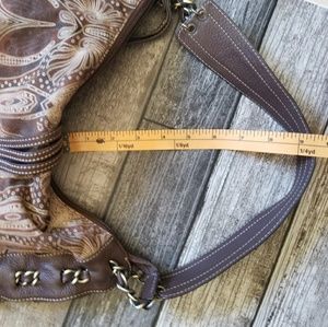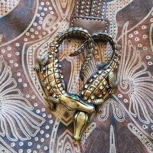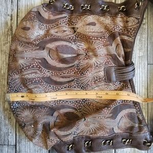Brown leather bag with intricate etched/embossed design. Decorative leather strap with ornate metal crocodile ornament. Decorative chain pattern along side edges. Zip closure. Brass toned hardware. Very light fading of design along bottom edges as shown in last photo (barely noriceable). Otherwise in great condition