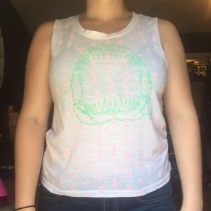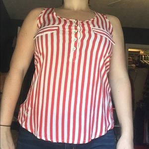 Different tanks I'm selling. I am willing to make separate listings if anyone only wants 1 or 2. There are 7. I can do all of them for $35 or individual for $7 each. A couple of them are gently used, others have been worn once or twice. Worn with a regular bra so you can see the shape of the straps in the back. Varying sizes. For references, I am a S in tops and my bra size is 34 DD. The chiffon tank buttons in the front and has a collar. Pineapple print on the first white tank.