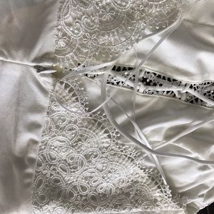 Ivory lacy bodysuit with boning, hook bottom enclosure, and back zipper. Material details to follow. PRICE FIRM.