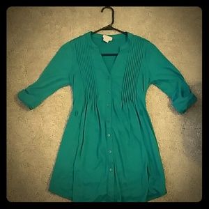 This tunic is a beautiful shade of green that my camera can't do justice. It is a soft material (65% polyester, 35% rayon) and can be tied in the front or back. It looks great with dark jeans or leggings. Worn only twice. XS in Juniors.