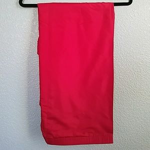 One of a kind! Beautiful three piece red silk A-line suit with heavy intricate embroidery along the neckline and lighter embroidery on the sleeves. Dupatta is made of the same material as the rest of the suit and has embroidery dotted all-over. The salwar is a straight style. The waist of this suit can be adjusted with drawstrings in the back as seen in the fifth picture. Top is 40in bust, 48in total length, and 15in long sleeves. Salwar is 39.5in length. Never worn!