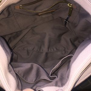 LOVE this bag but I'm a bit of a purse addict and I already have 2 other bags I also love that are similar to this one..and I'm trying or downsize! It's a beautiful blush color with a cutout design on the front and back. Features 3 interior pockets, 2 lg zippered sections on top, and a magnetic closure. 16x10. The only signs of wear is on handle and it could probably use a light cleaning. Nothing too bad. Happy to answer any questions. Comes from a smoke-free, pup friendly home.