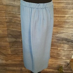 Light Blue Two Piece Skirt Suit. The suit is fully lined. The skirt has a back zipper. It has elastic on both sides, with a back slit.