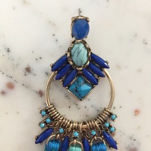 Vibrant & cheerful, the "Mirabel" fringe tassel drop earrings are perfect for a boho music festival. With their blue resin rhinestones & faux-turquoise gem embellishments, you're sure to turn heads in these oversized jewel statement earrings. They feature a gold colored circular zinc alloy ring with dainty blue & aqua thread/string tassels dangling below the hoop. They are stud earrings with push backs. Turquoise patterns vary. New with protective packaging.