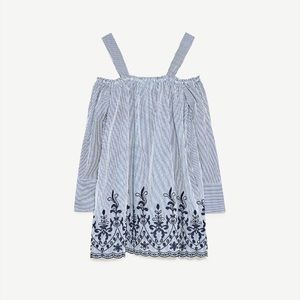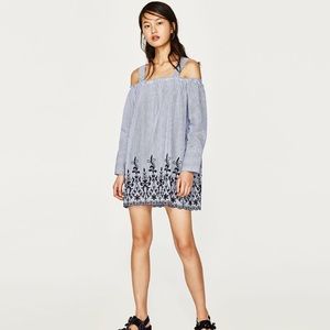 New with ragas Zara off the shoulder striped embroidered dress. Open shoulder with straps and long sleeves and tie bow and back. Striped fabric with embroidery at hem. Size small
