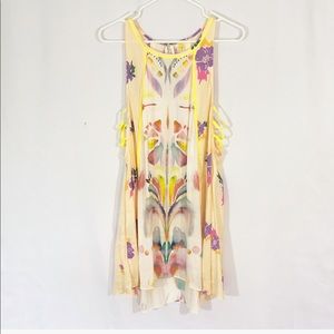 NEW WITHOUT TAG SILKY MIXED PRINT SLEEVELESS TUNIC WITH A FLOWY FIT & HIP POCKETS. DROPPED ARM HOLES WITH STRAPY DETAILING, & LOW BACK WITH BUTTON CLOSURE & NECK. 100% POLYESTER. BUST: 38" WAIST:30"