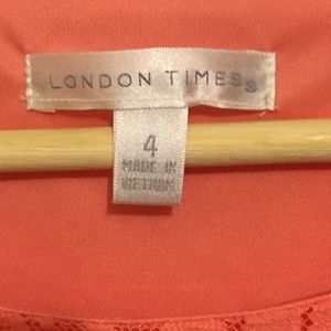 The coral/dark peach colored lace dress is so beautiful and the color just pops. Lace is a gorgeous flower detail with lace fringe at the bottom and on the sleeves. Dress bodice is lined with a matching satin type material, and sleeves are sheer. Sleeves go below the elbow.