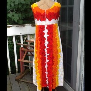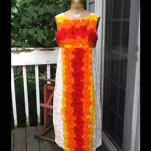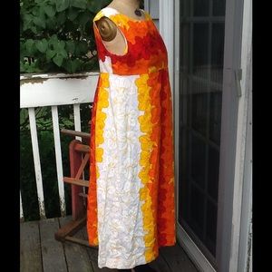 This is so bright and cheery..the perfect summer cruise dress...its in a bright Red Orange,Yellow and white,empire waist style back nylon zipper..the back is pretty it has a panel down the center,it's made in HAWAII by Ui-Maikai,100% cotton in EUC!! Measurements: L:48", B:38.5, SH:16", W:19" empire, Hips: free