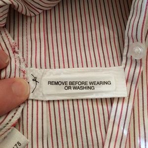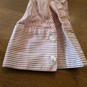 This blouse has never been worn (see last photo). Did not come with price tags as it was a gift. Made of 98% cotton and 2% spandex, it hugs the body very nicely but is long enough to tuck into a skirt or pants, if desired. Print is a burgundy and cherry pinstripe; looks terrific under a cardigan or blazer. First image courtesy of eBay.