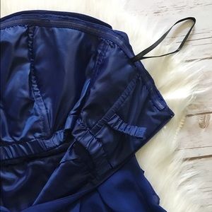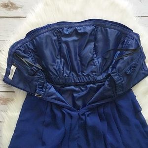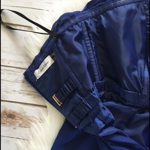 Calvin Klein Strapless Dress. Top/bodice is gathered with a tie front. Empire waist. Fully lined. Length about 31" from top of neckline to hem. Underarm to underarm about 14" (all measurements on one side when laid flat). Back zip with clasp at top about 11.5" long. Bodice has additional details for better fit on inside (see photos). Shell and lining both 100% Polyester. Dry clean only. Size unknown - would fit a small. Refer to measurements. In excellent condition.
