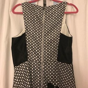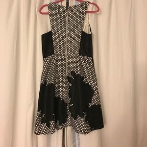 Black and white hatch print Vince Camuto dress. Silk fabric. Back zipper. Knee length dress with bold floral print at the bottom of the skirt. Brand new with tags. Smoke free and pet free home.