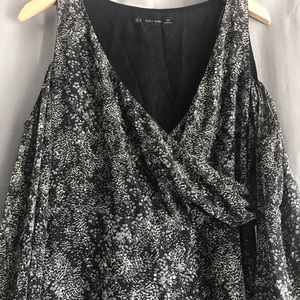 NWT ZARA Basic Printed Chiffon cold shoulder dress. Draping front. 3/4 bell sleeves. Hidden side zipper. Flowy skirt. Lined. Size medium.