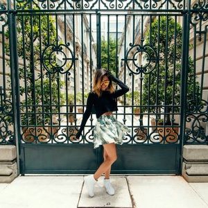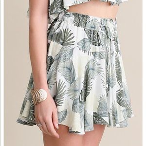 Ivory skirt with green palm leaf print. Built in shorts make this skort soooo cozy and easy to wear. Elasticized waist, front side pockets and tie bow front. Modeling size S.