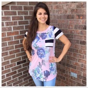 Striped Floral Pocket Tee in navy (also available in pink! Modeled in 3/4 length. No tags attached. $ FIRM UNLESS BUNDLED (10% off 3+ bundles). 1X: Bust 41" Length 28" (front) 30" (back) 2X: Bust 43" Length 29" (front) 31" (back) 3X: Bust 45" Length 30" (front) 32" (back) 🌸94% Polyester 6% Spandex 🌸Hand Wash 🌸Made in the USA🇺🇸 🚫Trades