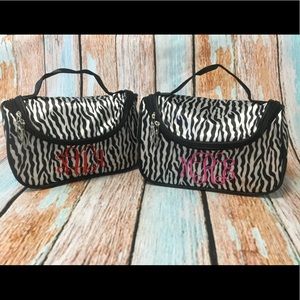 Compact cosmetic bag will organize your beauty essentials neatly in place.  Big dual zipper opening for easy access to your makeup items. Slots for makeup brushes and wide elastic strap on the inner side of the lid help to keep brushes handy.
