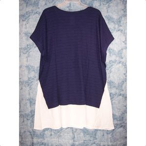 It's Navy & Black stripe in color with a white contrast hem, Scoop neckline, short cuffed sleeves, white hem is straight with side slits, fabric is 73%cotton, 27% rayon knit, contrast hem is 64% rayon, 36% polyester, machine washable. NWOT Comes from a smoke free home.