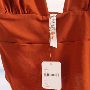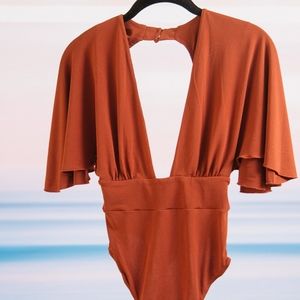 Never worn! Beautiful bodysuit featuring flowy sleeves and a cool, plunging structured neckline. Two buttons in the back of neck for closure. Extra button included with tags.
