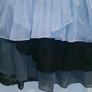 Flowing bottom half with deep V-neck and low scoop back soft stretchy top half. Fitted crochet style top into flowing ruffle skirt