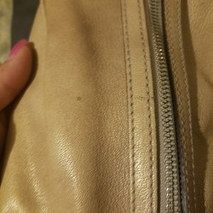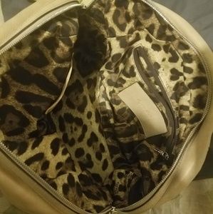 A beautiful neutral cream color with beautiful top stitching and silver hardware. Leopard interior with 1 slip pocket and 1 zipped pocket.