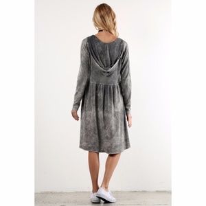 Mineral wash , long sleeve midi dress in a relaxed style with an attached hood and pleated detailing.