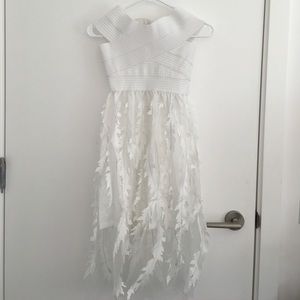 NOT for love and lemons - listed for exposure. Boutique item - I only have one! This dress is gorgeous and super unique. The top is stretchy and comfortable, while fitting. Can be worn off the shoulder or slightly on. The bottom skirt part has an inner layer that's short and a semi sheer outer layer with 3D leaves. Looks especially amazing for the summer at any outdoor event. Fits sizes XS - S. I am extremely careful in picking boutique items - they are all very high quality - see reviews.