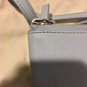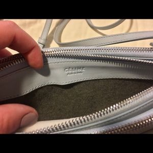 Large Celine Trio Crossbody. Largest size made. Smooth lambskin leather. Pale blue with silver hardware - Rare Spring color for 2017 collection, no longer offered. Three compartments are connecting together, can remove if need be. Adjustable Cross body strap. There is slight wear on this bag and pictures have been provided of those minimal items. One slight scratch on front, color run off on back. Purchased at Neiman Marcus in Houston, TX. Comes with dust bag and original tickets.