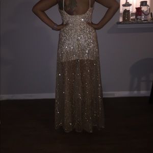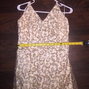 Champagne and cream dress . Under layer is a fitted short dress with mess overlay . Great condition .This dress does contain glitter size Large 7/8