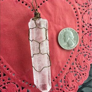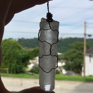 Just a plain Quartz Crystal Pendant I wrapped in antique copper wire. It's very big. I strung it on a hemp cord to make it ready to wear for the buyer, but it will be best to get it a good quality chain for comfort and to really show off this piece.