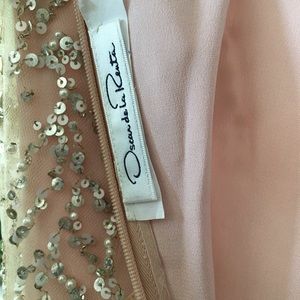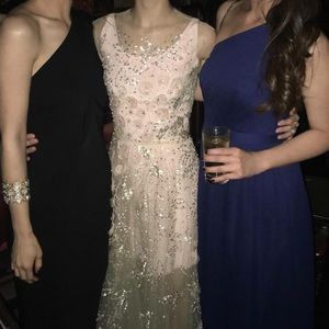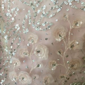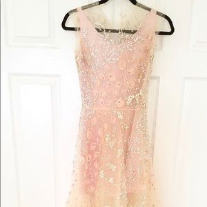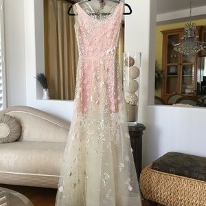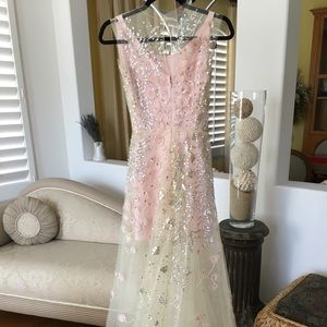 Beautiful detailing with a mini pink dress under a sheer floor length gown. Waist: 23 in, pink length: 30 in, length of entire sheer dress: 59 in. Only worn once. Slight rip on bottom right but not really noticeable (as seen in last photo)