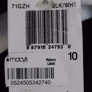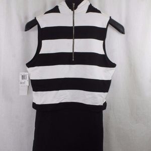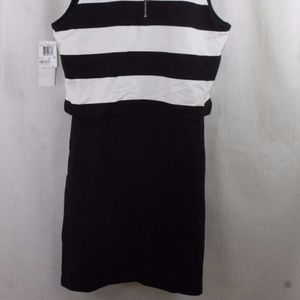 STYLE:VISCOSE/POLYESTER/ELASTANE;SLEEVELESS; BODICE IS B & W STRIPE; SKIRT IS SOLID BLACK; 1/2 BACK ZIPPER;