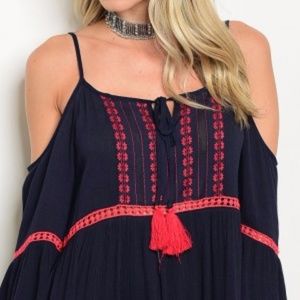 Bohemian inspired 3/4 cold shoulder embroidery detail tunic dress. just add a floppy hat and sandsals. Goregeous Navy blue color with red embroidering!