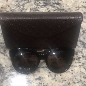 Stunning Dark Havana brown Gucci sunglasses with beige crystallized arms. Lens and frame may contain hairline scratches although have never been wornGucci inscribed on lens and temples of arms. Delivered with case and card only. Made in Italy. Look stylish while being 100% UV protected
