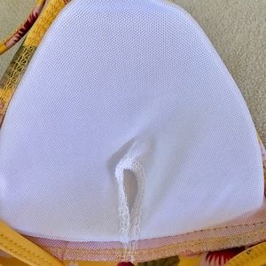 Super on trend bikini. Dark yellow color with beautiful floral design. Straps are adjustable. Padded top and there is a place where the padding can be reminded if needed. Last few pictures are of actual suit. Thicker high quality material.