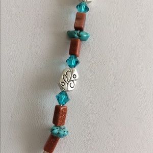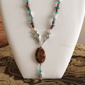 The necklace set has a western style. Throughout the necklace you will see turquoise, Goldstone gemstones, decorative silver beads and Swarovski Blue crystals. The necklace also has decorative silver components as the focal point of the necklace, with a beautiful brown cabachon pendant, Swarovski crystal and silver decorative bead. The earrings have a decorative component that is elegant but western, the crystals and goldstone are dangling with silver headpins. They also have lever fasteners.