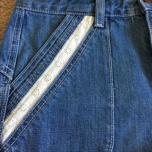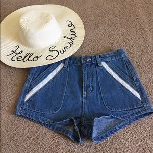 Free People high rise Denim Shorts featuring slanted front pockets with eyelet trim, back slit pockets, zip fly and button closure. Color is labeled blue (light Denim). Questions always welcome and offers welcome using the offer button.