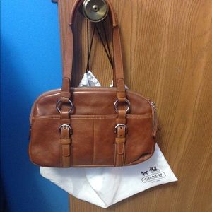 Dark tan/brown Coach bag. Pretty pink satiny interior. Very good condition (Used only a few times). Several compartments and three pockets. Care instructions included.