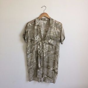Urban Outfitters - collar - hidden button down shirt - single pleat in the back - rolled dolman sleeves - two front pockets - long full length, cute tied up at a crop top - velvet raised camouflage pattern, slightly see through