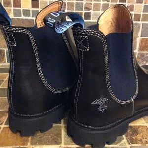 Beautiful boot!! Thick rubber soles, made in Poland, nice smooth leather with contrast stitching, smooth pull up with elastic gussets.