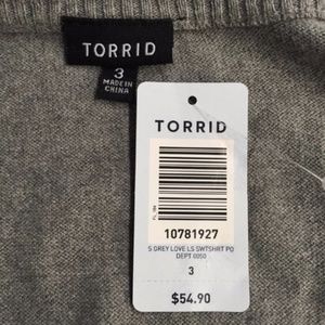 Beautiful love sweatshirt from torrid! Cute heart detail. Grey with black lettering and red heart. Soft and comfy. Banded at the bottom of the sleeves and hem. New with tags, never worn. Undamaged. Smoke and pet free home. Measurements taken laid flat. 25.5" bust. 22.5" waist. 29" long shoulder to hem. 100% cotton. Stretchy.