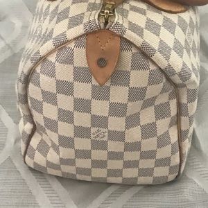 Authentic Louis Vuitton speedy 30 Damier Azur canvas has been used pictures show stains inside the purse but overall a beautiful handbag it comes with dust bag lost lock and key. Please feel free to ask any questions. Comes from a pet free and smoke free home. Measurements 11.8x8.63x6.7" buy with confidence all my items are 100% authentic