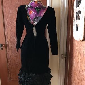 Svelt! Vintage Black Velvet Dress w/ Silk Taffeta flower petal skirting along the bottom, plunging V-neck w/ built-in breast cups, zip-up back. By Wilson Folmar, for Edward Abbott, New York. Form fitting to showcase a small waist and hourglass figure i.e. Marilyn Monroe. Worn by Jane W., a late 50's Revlon Girl model. I wore it in a short film and to various clubs, art openings and operas. Has some signs of wear, but the nighttime occasion dress is still beautiful!